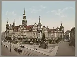Das Residenzschloss Dresden ist die ehemalige Hauptresidenz der Kurfürsten und Könige von Sachsen in der Altstadt von Dresden. Die Vierflügelanlage wurde 1548 durch Kurfürst Moritz von Caspar Vogt von Wierandt im Renaissancestil begonnen und 1901 durch König Albert von Gustav Dunger und Gustav Frölich im Neurenaissancestil vollendet.[1] Nach der Zerstörung 1945 wird das Residenzschloss seit 1986 für die Staatlichen Kunstsammlungen Dresden wiederaufgebaut und ist inzwischen eines der meistbesuchten Museen der Stadt. Hervorzuheben sind das Grüne Gewölbe, das Kupferstich-Kabinett, das Münzkabinett, die Rüstkammer und die Paraderäume Augusts des Starken.[2]