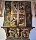 Maria-Magdalenenkirche (Burgkirche) | Doppelflügelaltar mit einem Paar festen Standflügeln sowie Predella (Mittelschrein 238,5 × 134,5 × 30 cm; Flügel 238,5 × 67 × 22 cm; Standflügel 256 × 67 cm). Auftragsarbeit der aus Lübecker Patriziern bestehenden Heiligen Leichnamsbruderschaft im Wert von 451 Mark lübisch.[11] | ||