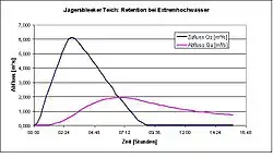 Da bei erhöhten Pegelständen in Flüssen auch das erhöhte Wasservolumen ein Retentionspotential bietet, wird ein im Oberlauf ausgelöstes Hochwasser, je weiter es nach Stunden oder Tagen in den Unterlauf kommt, immer weiter abgeschwächt. Dieser Effekt ist umso stärker, je länger die Fließstrecke ist und je breiter ein eventuell vorhandenes Überschwemmungsgebiet dem Fluss zur Verfügung steht.[4] Durch zunehmende Eindeichung von Flüssen sowie durch Flussbegradigungen in den vergangenen Jahrhunderten wurde das Retentionsvermögen vieler Flüsse herabgesetzt.