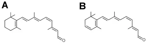 Zwei isomere Formen des Retinals sind beim Sehvorgang wichtig: das 11-cis-Retinal (Retinal 1, Vitamin A1-Aldehyd) sowie das all-trans-Retinal. 11-cis-Retinal ist der lichtempfindliche Bestandteil des Rhodopsin-Moleküls, das in den Stäbchen des Auges (siehe Retina) der für das farbneutrale Sehen entscheidende lichtempfindliche Chromophor ist. Durch Absorption von Licht wird das 11-cis-Retinal in die all-trans-Konfiguration überführt,[5] in der es sich von der Proteinkomponente des Rhodopsins, dem Skotopsin, trennt.