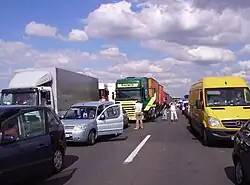 Im Stau oder bei einem Verkehrsfluss in Schrittgeschwindigkeit ist ein ausreichender Abstand zum vorausfahrenden Fahrzeug einzuhalten, um gegebenenfalls ein Rangieren zu ermöglichen. Der ADAC empfiehlt einen Abstand von 5 Metern (etwa eine Wagenlänge).[22] Dies kann beispielsweise bei Engstellen, wie Autobahnbrücken, Tunneln, Baustellen oder bei durch defekte Fahrzeuge blockiertem Seitenstreifen nötig werden.