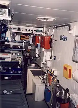 - Der Sanitätswagen ist wie die Transportwagen vollständig gasdicht, mit einer außenluftunabhängigen Luftversorgungsanlage sowie einer Schleuse ausgestattet und verfügt darüber hinaus über eine eigene Notstromversorgung. An medizinischer Ausrüstung werden unter anderem 17 Beatmungsgeräte und 400 Infusionen mitgeführt. Der Wagen ist über eine ebenfalls gasdichte Schleuse mit dem Transportwagen II verbunden. Er hat zwei Intensivbehandlungsplätze und 18 Liegeplätze für Schwerverletzte sowie Sitzmöglichkeiten für Leichtverletzte.[4]