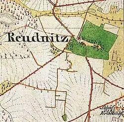Reudnitz wird in einer Urkunde von 1372 erstmals genannt. Der Name wird von sorb. ruda = Raseneisenstein abgeleitet.[3] Nach der Dorfstruktur war es ein Sackgassendorf.