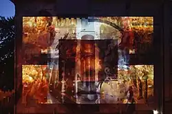 Dialog zwischen traditioneller Malerei (Wandgemälde „Revolution und Krieg“) und medialer Gegenwartskunst (Videoprojektion „Aus dieser Asche steigt kein Phönix“).