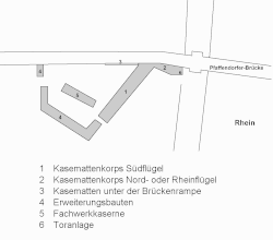 Die preußische Stadtbefestigung der Großfestung Koblenz verlief in einem Viertelbogen vom Rhein (an der Stelle der heutigen Pfaffendorfer Brücke) bis zur Mosel (etwa an der Stelle der heutigen Europabrücke). Die am meisten gefährdeten Punkte waren dabei die Verbindungen oder Anschlüsse zu den beiden Flüssen. Am Rheinanschluss wurde daher ein Festungswerk mit großer Feuerkraft (43 Kasematten-Geschütze) errichtet. Sowohl die Schifffahrt auf dem Rhein als auch beide Uferstraßen konnten von dort aus mit Sperrfeuer belegt werden. Das zweistöckige Kasemattenkorps bestand aus einem etwa 100 Meter langen Südflügel mit 15 und einem etwa 17 Meter langen Nord- oder Rheinflügel mit 7 Kasematten. An dessen Ende zum Rhein hin befand sich ein Poternentor mit Zugbrücke, die über einen Wassergraben führte.[1]