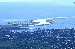 Die Mündung des Alpenrheins wurde vom Flachwasserbereich seewärts bis zum Steilabfall des Seeufers, der Halde, verlegt. Dazu wurde seit den 1970er-Jahren ein S-förmiger rund 5 Kilometer langer Damm errichtet, der die Sedimentmassen in die tieferen Bereiche des Bodensees führt.[12]
