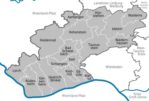 - ↑ Gesetz zur Neugliederung des Rheingaukreises und des Untertaunuskreises (GVBl. II 330-30) vom 26. Juni 1974. In: Der Hessische Minister des Inneren (Hrsg.): Gesetz- und Verordnungsblatt für das Land Hessen. 1974 Nr. 22, S. 312 (Online beim Informationssystem des Hessischen Landtags [PDF; 1,5 MB]).