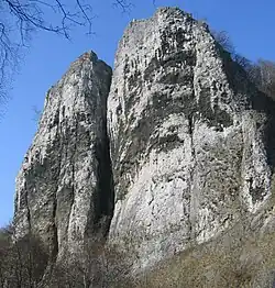 Massenkalk-Klippen „Pater und Nonne“ (Givet-Stufe, Mittel-Devon) im Tal der Lenne bei Iserlohn