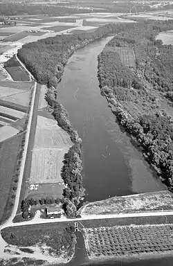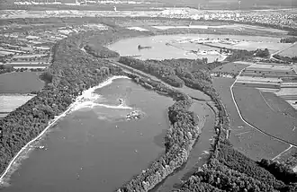 ![]() Rheinniederungskanal zwischen dem Streitköpflesee (vorne links) und dem Baggersee Mittelgrund (hinten rechts), im Hintergrund Leopoldshafen (Fotograf: Willy Pragher, 1973) | ||
