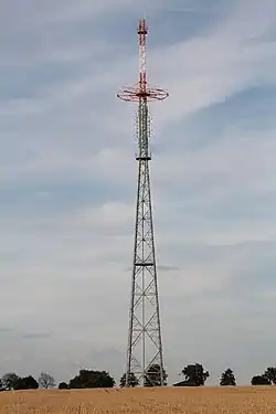 An der Stelle des im Jahr 2002 abgerissenen Sendemasts 1 wurde im Dezember 2003 ein geerdeter, freistehender, 102 m hoher Stahlfachwerkturm errichtet, von dem seit 2004 auf der UKW-Frequenz 94,9 MHz das Programm von SWR4 Rheinland-Pfalz mit 5 kW gesendet wird. Zuvor war diese UKW-Ausstrahlung über den 114 m Reservemast für Mittelwelle erfolgt. Der im Jahr 2003 neu erbaute Sendeturm wurde 2004 nachträglich mit einer Reusenantenne als Mittelwellen-Reserveantenne versehen. Über sie konnte auf der Frequenz 1017 kHz analog mit 100 bzw. 150 kW ausgestrahlt werden.[14] Nachdem der Mittelwellenbetrieb von diesem Senderstandort im Jahr 2012 komplett eingestellt wurde, ist auch die Reusenantenne überflüssig geworden und wurde Anfang März 2013 demontiert.