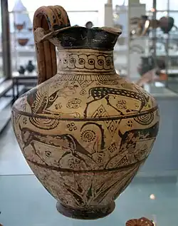 Tierfriese sind seit dem 8. Jahrhundert v. Chr. in der griechischen Vasenmalerei bekannt. Zunächst wurde vor allem eine idyllische Welt wie im unteren Fries gezeigt. Ostgriechische Werkstätten indes brachten den Gegensatz von Mischwesen und Fabelwesen sowie Raubtieren hinzu, die für eine inhaltliche Spannung sorgten. Auch die Verzierungen sind klar ostgriechisch, insbesondere rhodisch. Die äußere Form, aber auch die Tierfriese folgen metallenen Vorbildern.