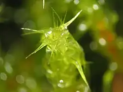 Typisch sind die sparrig beblätterten Stämmchen: Die aus einem breit ovalen Grund plötzlich lang zugespitzten Blätter sind in der Mitte deutlich nach unten umgeschlagen. Lediglich die Blätter an den Spitzen der Stämmchen stehen waagerecht ab und bilden dadurch einen sternförmigen Kranz, was die Namensbildung „Kranzmoos“ erklärt. Eine Blattrippe fehlt oder ist kurz und doppelt. Die Blätter sind ganzrandig oder nur an der Spitze gesägt.