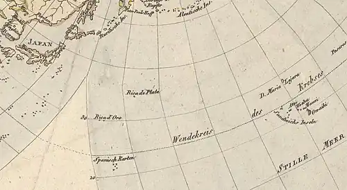 - Fußnote: Die Existenz dieser Insel beruht bloß auf einer Note in den philosophischen Transactionen von 1674 Nro. 109 S. 201. Hier heißt es: in der Südsee 37 ½ ° N. Br. und etwa 28° der Länge liegt ostwärts von Japan eine hohe große Insel. Sie ist von schönen weissen Leuten bewohnt, welche gefällig und civilisirt sind, auch Gold und Silber in Menge besitzen. Dies hat vor einiger Zeit ein spanisches Schiff berichtet, das von Manilla nach Neuspanien segelte.“[9]