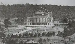 Bereits am 22. Mai 1872, Wagners 59. Geburtstag, konnte bei strömendem Regen der Grundstein gelegt werden.[5] Wagner hielt eine Rede[6] und dirigierte zu diesem Anlass Beethovens 9. Sinfonie im Markgräflichen Opernhaus. Der Bau verzögerte sich aus finanziellen Gründen immer wieder. Der geplante Verkauf von 1000 Patronatsscheinen für je 300 Taler verlief nur schleppend; bis zum Frühjahr 1876 waren weniger als die Hälfte verkauft. Auch auf den deutschen Kaiser, den Reichskanzler und den Reichstag hoffte Wagner trotz Unterstützung durch Gräfin Schleinitz vergebens. Finanzielle Hilfe erhielt er vom Osmanischen Sultan Abdülaziz in Höhe von ungefähr 96.000 Euro nach heutiger Kaufkraft (2025).[7][8]