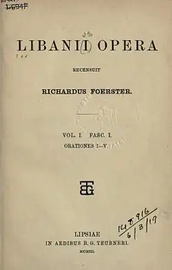 - Libanii Opera. Zwölf Bände, Leipzig 1903–1927. (Nachdrucke: Hildesheim 1963, 1985, 1998)
