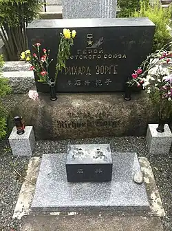 - ↑ ゾルゲが恋人と眠る多磨霊園:伝説のスパイの足跡を訪ねて. In: nippon.com. 30. Juni 2018, abgerufen am 23. November 2024 (japanisch, Die Inschrift des hellen Gedenksteins ist als Detailaufnahme zu sehen (viertes Bild von oben). In den ersten beiden Zeilen steht sinngemäß: „Hier ruht ein Held, der sein Leben in Opposition zum Krieg für den Weltfrieden geopfert hat.“).