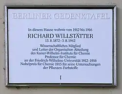 Von Oktober 1912 an arbeitete Richard Willstätter am Kaiser-Wilhelm-Institut für Chemie in Berlin-Dahlem. Er wurde zugleich wissenschaftliches Mitglied der Kaiser-Wilhelm-Gesellschaft.[11] Fritz Haber, der Direktor des in der Nähe gelegenen Kaiser-Wilhelm-Instituts für physikalische Chemie und Elektrochemie, hatte Willstätter durch seine Korrespondenz für eine führende Rolle am Kaiser-Wilhelm-Institut für Chemie gewinnen können.[12] Diese beiden Forschungseinrichtungen für Chemie wurden im Oktober 1912 gemeinsam als die ersten Kaiser-Wilhelm-Institute eröffnet. Als Honorarprofessor erhielt Willstätter auch die Lehrbefugnis an dem von Emil Fischer geführten Chemischen Institut der Friedrich-Wilhelms-Universität Berlin.