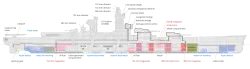 - ↑ Sie hatten auf jeder Schiffsseite eine Breite von maximal 2 Metern und sollten die Energie einer Torpedoexplosion von 300 kg TNT absorbieren. Die gesamte Breite des Torpedoschutzes erreichte 5 bis 7 Meter auf jeder Seite.