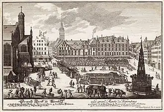 Nürnberger Hauptmarkt (1714), Mitte-rechts das Rieter'sche Haus zur ersten Bitte