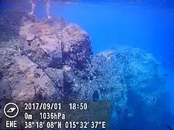 Belebtes Felsenriff als untermeerische Fortsetzung der Felsenküste bei Messina (Acquarone-Kliff), Sizilien