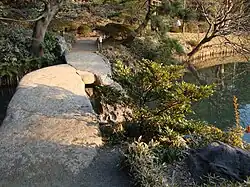 Im großen Teich in der Mitte des Parks befinden sich die übliche „Inneninsel“, die über eine Brücke erreichbar ist. Auf der Insel gibt es zwei Anhöhen, Imoyama, Seyama (妹山・背山) genannt, die Mann und Frau als Paar symbolisieren. Weiter gibt es in dem Teich eine kleine „Insel der Glückseligen“ (蓬莱島, Hōraijima). Zu ihr führt eine „Schwimmende Schildkröten-Brücke“ (亀浮橋, kame-ukihashi), bestehend aus Buckelinseln. Auch ein „sich hinstreckenden Drachen“ (臥竜石, Garyū seki) ist in dem Teich zu sehen. Das Ufer des Teichs ist mit „Gezeitenhafen“ (出汐の湊, Deshio no minato), „Seegras-Ufer“ (玉藻の磯, Tamamo no iso) und „Quell-Gestade“ (吹上浜, Fukiage hama) abwechslungsreich gestaltet.