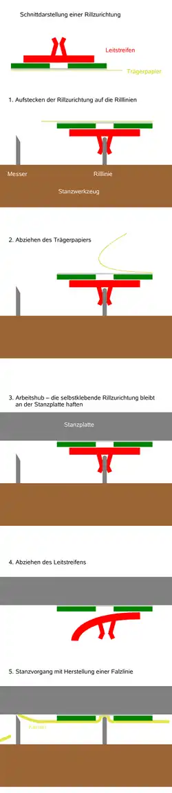 Es handelt sich um Streifen, die auf dem Stanzwerkzeug auf die Rilllinien aufgesteckt werden; hierfür ist auf der Vorderseite ein Leitstreifen aus Kunststoff aufgeklebt, der auf die Rilllinien passt. Die Zurichtstreifen selbst bestehen ebenfalls aus Kunststoff (z. B. PVC) oder aus Pressspan, teilweise zusätzlich mit einer Metallfolie. Die Rückseite der Streifen ist selbstklebend und wird durch Ausführen eines Arbeitshubes der Stanzmaschine auf die Unterlage (Stanzplatte, eine Metallplatte) übertragen.