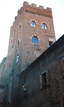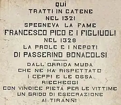 Andere Skelette identifizierte man als die der beiden Söhne von Rinaldo Bonacolsi, Giovanni und Francesco und dessen Neffen, die dort 1328 von Luigi I. Gonzaga eingekerkert und dem Hungertod überlassen worden waren. Über dem Haupteingang der Burg erinnert heute eine steinerne Tafel an die dort im Hungerturm zu Tode gekommenen Opfer.[39]