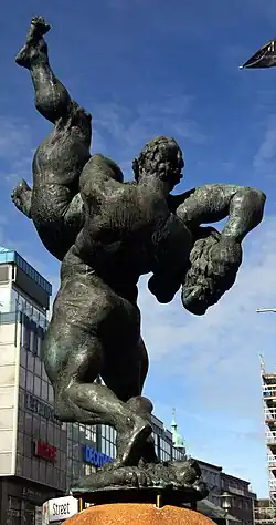 So weit die offensichtliche mythologische Interpretation. Schaut man genauer hin, so erkennt man auf dem Trikot des hochgehobenen Riesen zahlreiche Personennamen, darunter Rudolf Krämer-Badoni und Peter Iden,[4] und deutlich das Wort „Kritik“. Der auf dem Boden stehende Ringer trägt auf einer Hüftseite das kreisrunde, ineinander übergehende Signet „JW“, auf der anderen ist „Jürgen Weber“ zu lesen. So kann die Figurengruppe auch als der Kampf des Künstlers Jürgen Weber gegen (Kunst-)Kritiker verstanden werden, denen der Künstler den Boden entzogen hat.