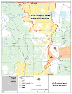 Das Rio Grande del Norte National Monument steht unter der Verwaltung des Bureau of Land Management (BLM). Die gesamten Flächen befinden sich im Bundesbesitz und wurde bereits vor der Ausweisung vom BLM betreut.[1]