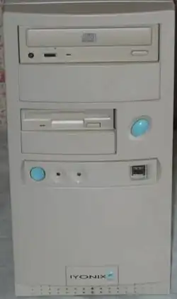 Ende des Jahres 2002 überraschte Castle Technology Ltd., welche bereits die Fortführung der Herstellung von RiscPC und A7000 bzw. A7000+ übernommen hatten und mit der Kinetic Karte für weitergehende Benutzbarkeit sorgten, mit der Vorstellung einer komplett neuen Maschine, des IYONIX.[65][66][67] Dieser basierte auf einer Hardware, die deutlich vom bisherigen Systemaufbau abwich (Grafikbaustein, I/O Chip) und daher eine Anpassung des Betriebssystems auf unterster Ebene erforderte. Gelöst wurde dies durch Einführung einer Hardwareabstraktionsschicht (HAL) ins RISC OS. Auf Softwareseite führte dies zu Inkompatibilitäten und der Erfordernis, Programme anzupassen. Insbesondere auch, dass die XScale CPU das Prozessorstatusregister nun endgültig von der Speicherverwaltung (Programm Counter) ablöst, erforderte Änderungen. Man spricht hier dann von sogenannter 32 Bit Software[68], im Gegensatz zu der ursprünglichen 26 Bit Software, bei welcher es sich aber natürlich auch um 32 Bit breite Daten und Register handelt, da die ARM-CPU von Beginn an 32 Bit Register verwendete, allerdings den Speicherzugriff nur mit einer Adressbusbreite von 26 Bit erlaubte. Durch die Anpassungen kann der Iyonix einen schnell getakteten XScale '80321' Chip mit 600 MHz verwenden und auch sonst auf günstigere Hardwarebauteile aus dem StandardPC-Bereich setzen. Insbesondere IDE-Anbindung, Arbeitsspeicher (200MHz DDR-SDRAM) und die Grafikkartennutzung profitieren davon und beschleunigen so das Gesamtsystem deutlich.[69] Ausgeliefert wurde er zudem mit einem kompletten Satz an Nutzertools und Programmen, wie z. B. einer Textverarbeitung und einem PDF-Betrachter.