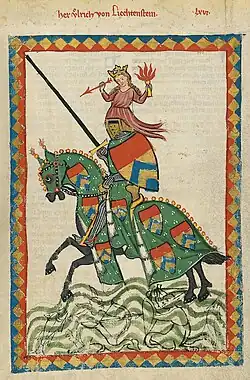 Das Wort ritter oder auch rîter entspricht dem lateinischen miles und bezeichnete einen schwer bewaffneten Reiterkrieger und Soldaten. Der Dienstgedanke, wie man ihn später beim Minnedienst findet, ist hier bereits angelegt; militare bedeutet nämlich so viel wie Kriegsdienst tun oder schlicht dienen.[15] Es gehörte zu den Pflichten eines Ritters am Hofe, nach der Gunst einer Dame zu streben. Die höfischen Damen kamen dem Wunsch nach Erhörung und Minne jedoch in der Regel nicht nach. Das Umwerben der Frau wurde mit einem mühsamen Dienst gleichgesetzt.
