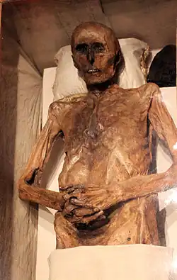- ↑ A. C. Aufderheide: The geography of mummies. In: A. C. Aufderheide (Hrsg.): The Scientific Study of Mummies. Cambridge University Press, Cambridge 2003, S. 170.