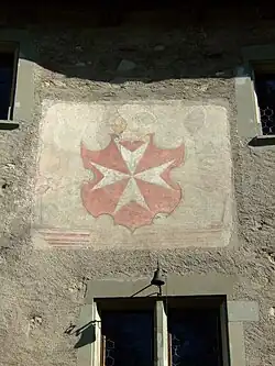Bauliche Situation der Kommende mit den Wappen des Gründers Diethelm von Toggenburg, des damaligen Komturs Johann von Hattstein und der Kommende