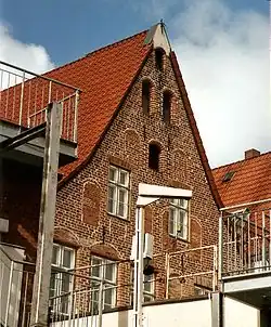 Das erwähnte holländische Ziegelformat ist nur als Verblendung und für das Giebelmauerwerk zur Verwendung gekommen. In den unteren Fassadeteilen besteht die Hintermauerung aus dem sonst früher gebräuchlichen größerem Format. Vielleicht sind hier auch noch Teile der Fassade des früheren Hauses wieder benutzt. Jedenfalls rührt der abgeschrägte und von schmalen stichbogigen Lucken durchbrochene Hintergiebel noch aus dem 16. Jahrhundert, und gleichaltrig mit diesem ist auch noch der mächtige eichene Dachstuhl mit 24/24 cm starken Sparren. So ist auch die jetzige Fassade ganz unabhängig von dem dahinter befindlichen Dach lediglich für die äußere Erscheinung komponiert, indem das Hauptgesims nicht der Dachbalkenanlage entspricht, sondern diese bereits über dem 2. Obergeschoss liegt; das Halbgeschoss hierüber ist also schon Dachgeschoss. Auch die drei großen Giebelfenster sind nur dekorativ, sie werden im Innern von der Kehlbalkenlage des Daches durchschnitten (siehe nebenstehendes Bild). Dass durch diese rein konstruktiv anfechtbare Willkür ein kräftiger Rhythmus in die Fassadenkomposition hineingetragen ist lässt sich jedoch nicht leugnen.