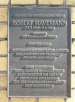 - ↑ a b Robert Havemann (1910–1982). Todesurteil 1943, Nationalpreis 1959, Berufsverbot 1965, Hausarrest 1976 (Vortrag vor der Leopoldina in Halle und der Universität Tübingen im Oktober 2004). In: zeitzeugenbuero.de, S. [6], abgerufen am 1. August 2024.