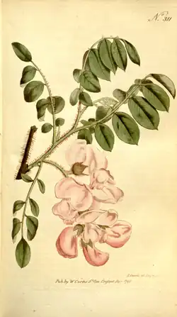 - Borstige Robinie (Robinia hispida L.): Dieser 1,5 bis 3 Meter hohe Strauch ist in den Vereinigten Staaten, von Virginia bis Kentucky beheimatet.[5]