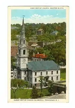 1639 ist Williams unter den Gründungsmitgliedern der ersten amerikanischen Baptistengemeinde zu finden. Im gleichen Jahr ließ er sich als Erwachsener taufen.[3] Glaubens- und Religionsfreiheit gehörten zu den Grundstatuten dieser Gemeinde und wurden richtungsweisend in der Entwicklung des Baptismus. Um die Unabhängigkeit seiner Ansiedlung und die Religionsfreiheit zu sichern, reiste Williams 1643 nach England und ließ sich dort seinen Landerwerb mittels eines Patents bescheinigen. Nach seiner Rückkehr entwarf er eine Verfassung für Rhode Island, in der zum ersten Mal in der Geschichte die völlige Trennung von Staat und Kirche verankert war.[4] Diese Verfassung wurde nach anfänglichen Schwierigkeiten angenommen. 1644 argumentierte Williams in The Bloody Tenent, dass Jesus zwischen dem politischen und dem religiösen Bereich differenzierte, im Unterschied zum mosaischen Gesetz. Der Staat müsse den Einzelnen, das Eigentum und den Frieden schützen. Die Kirche hingegen befasse sich mit geistlichen Dingen.[3] Williams verknüpfte die von den separatistischen Kongregationalisten der Plymouth Colony und den Puritanern der Massachusetts Bay Colony geschaffene repräsentative Demokratie mit der Glaubens- und Gewissensfreiheit. Alle erwachsenen Männer hatten das Wahlrecht, unabhängig von ihrer Zugehörigkeit zu einer Kirche.[5]
