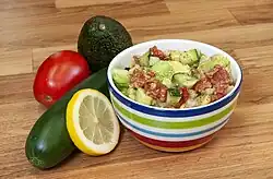 Zusammengesetzte Rohkostsalate können verschieden kombiniert werden wie z. B. Avocadosalat, Rote-Bete-(Meer)Rettich-Salat, Sauerkrautsalat mit Äpfeln und Zwiebeln, Fenchel-Sellerie-Apfel-Salat.[3]