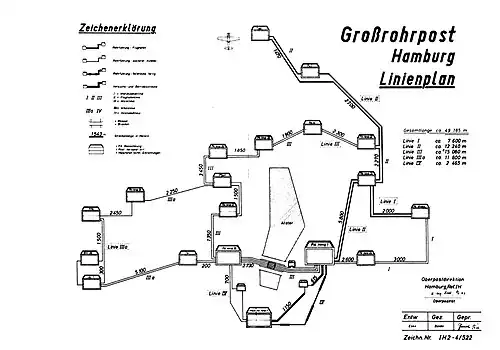 Die erste Strecke verband wie zuvor schon in London und anderen Städten das Haupttelegrafenamt am Gorch-Fock-Wall mit der Börse am Adolphsplatz, um Börsennachrichten aus aller Welt schnellstmöglich zu den Händlern zu befördern. 1912 erreichte das Hamburger Rohrpostnetz eine Gesamtlänge von 19,5 km.[1] Bereits 1907 war das Postamt im neuen Hauptbahnhof angeschlossen worden, ebenso das benachbarte Bahnpostamt am Hühnerposten sowie der Eilpostpavillon an der Ecke Steintordamm/Steintorwall (heute als Metronom-Verkaufsstelle genutzt). Dieser diente zugleich als zentrale Entladestelle für die im Stadtgebiet verkehrenden Straßenbahn-Briefkästen und verfügte über eine Tunnelverbindung zu den Fernbahnsteigen, durch die die Eilpostsäcke über Aufzüge direkt zu den abgehenden Zügen transportiert wurden und umgekehrt. In den 1920er Jahren erhielt der Pavillon eine eigene Rohrpostverbindung zum Haupttelegrafenamt.[2]