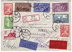 Im Falle des abgebildeten Briefes handelt es sich um ein Auslands-Einschreiben aus Norwegen per Luftpost und Eilboten. Aus den Beförderungs- und Behandlungsvermerken auf Vorder- und Rückseite des Briefes kann sein Weg von Oslo an den Empfänger in Hamburg rekonstruiert werden.