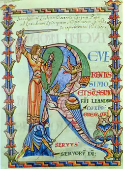 Etwa ab dem späten 11. Jahrhundert fasst man, ausgehend von der Architektur, die bis dahin auch regional unterschiedenen europäischen Kunststile als Romanik zusammen. Einerseits nahm die Zahl der produzierten Handschriften beträchtlich zu, gleichzeitig verwischten die landschaftlichen Unterschiede zugunsten eines relativ einheitlichen Formenvokabulars, wenn dieses auch stark von der jeweiligen Künstlerpersönlichkeit des Buchmalers individuell ausgestaltet war. Der charakteristische Buchtyp der Romanik war die große illustrierte Bibel. Besonders nördlich der Alpen war sie vorwiegend mit historisierten, das heißt mit figürlich gestalteten, Initialen ausgeschmückt, die unabhängig vom illustrierten Text mit Fabelwesen, Chimären, zoomorphen Gestalten oder auch Alltagsszenen bevölkert wurden, die in der repräsentativen Kunst noch keinen Platz hatten. Charakteristische Stilelemente der Romanik sind feste Umrisslinien, eine klare Gewichtsverteilung der Figuren und ornamentale Symmetrie. Wahrscheinlich beruht ein Großteil der romanischen Miniaturen – ausgenommen die typischen Zierbuchstaben – auf der monumentalen Wandmalerei.[1] Diese Abhängigkeitsverhältnisse sind heute kaum noch nachzuzeichnen, da sich nur sehr wenige romanische Fresken erhalten haben.