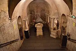 - karolingische Kathedrale mit rechteckigem Chor auf rechteckiger Krypta (Gangkrypta mit zwei Nebenräumen)[12]