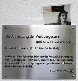 - ↑ Fototermin und Gedenkstunde: Einweihung der Informationstafel für den Dichter Ronald M. Schernikau in Berlin-Hellersdorf 05.09. 18. Dezember 2016, abgerufen am 12. März 2025.