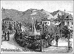 In der von den ortsansässigen Baumeistern Gebrüder Ziller 1876 erschlossenen Albertstraße, benannt nach dem seinerzeitigen sächsischen König Albert, ab 1904 Kaiser Friedrich-Allee, entstand 1890–1892 der Fontainenplatz. Um das Rondell mit Figurengruppe herum schuf Moritz Ziller auf eigene Kosten der Gebrüder Ziller, unterstützt durch die Baufirma F. W. Eisold und den Landschaftsgärtner Gustav Pietzsch,[5] einen ovalen Platz, um den herum vier Villenbauplätze bestanden. Auf dem Rondell entstand in einer Grünfläche ein Brunnenbecken mit der namensgebenden „Fontaine“, die vom Zillerschen Wasserwerk im Lößnitzgrund gespeist und betrieben wurde, um mit dem sprudelnden Wasser ein entsprechend verbessertes Umfeld zu schaffen.