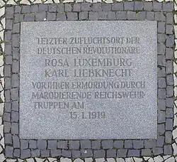 - ↑ Achim Kessler, Krzysztof Pilawski: Einzige Rosa-Luxemburg-Gedenktafel in Polen ist an ihren Platz zurückgekehrt. Ein Kampf zwischen Erinnerung und Entkommunisierung. Rosa-Luxemburg-Stiftung