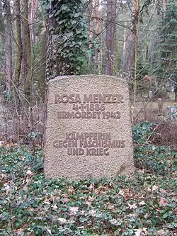 - ↑ Der 28. Mai 1942 wird auf der „Sterbeurkunde“ Menzers des Standesamtes Ravensbrück II (Nr. 1366/42) als Todestag angegeben. Vgl. Sigrid Jacobeit: Die Rote Rosa von Striesen. Rosa Menzer. In: Sigrid Jacobeit, Lieselotte Thoms-Heinrich: Kreuzweg Ravensbrück. Verlag für die Frau, Leipzig 1989, S. 125.