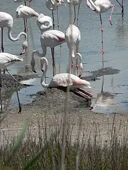 Natürliche Einflüsse wirken sich jedoch in der Regel stärker als Störungen auf den Bruterfolg aus. Drastische Veränderungen im Wasserstand können unabhängig vom Brutfortschritt ein Anlass für brütende Flamingos sein, ihr Gelege aufzugeben. Stark steigende Wasserstände gefährden nicht nur Gelege, sondern auch die Jungvögel. Fallen die Wasserstände zu stark, ist die Kolonie oder die Crèche für Prädatoren leichter erreichbar. Regen und starke Winde sind weitere Faktoren, die entweder dazu führen, dass Rosaflamingos während der Bebrütung des Eis nur unzureichend Nahrung finden und deswegen ihre Brut aufgeben oder zur Folge haben, dass sie ihren Nachwuchs nicht ausreichend füttern können.[67] Für die Camargue ist nachgewiesen, dass selbst geringe Änderungen im Wasserstand einen Einfluss auf das Körpergewicht flügge werdender Rosaflamingos haben. Dies wiederum hat einen Einfluss auf die Überlebenschance der Jungvögel.[68]