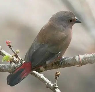 Beim Weibchen sind Oberkopf, Hinterhals und Kopfseiten bräunlich-grau, aber manchmal mit rotem Anflug. Es weist sehr große Ähnlichkeit mit dem Weibchen des Dunkelamaranten auf. Die Zügelgegend kann je nach Unterart kräftig rot sein. Die Jungvögel sind auf der Körperoberseite fahl erdbraun. Ihnen fehlt noch der rötliche Anflug, lediglich die Oberschwanzdecken sind rötlich.