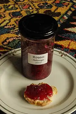 Rosenkonfitüre ist eine Konfitüre, die aus Blütenblättern der Damaszener-Rosen hergestellt wird, indem sie in Zucker mazeriert werden; besonders beliebt im Mittleren Osten und dem Balkan.[1]