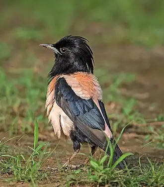 Das Körpergefieder der adulten Tiere ist ein mattes Rosa und kontrastiert zu schwarzem Kopf, Flügeln und Schwanz. Den Kopf des Männchens ziert ein bis in den Nacken reichender Schopf, und er weist wie die Flügel einen grünmetallischen Glanz auf. Das Weibchen ist insgesamt matter gefärbt, mit kürzerem Schopf und brauneren Flügeln.